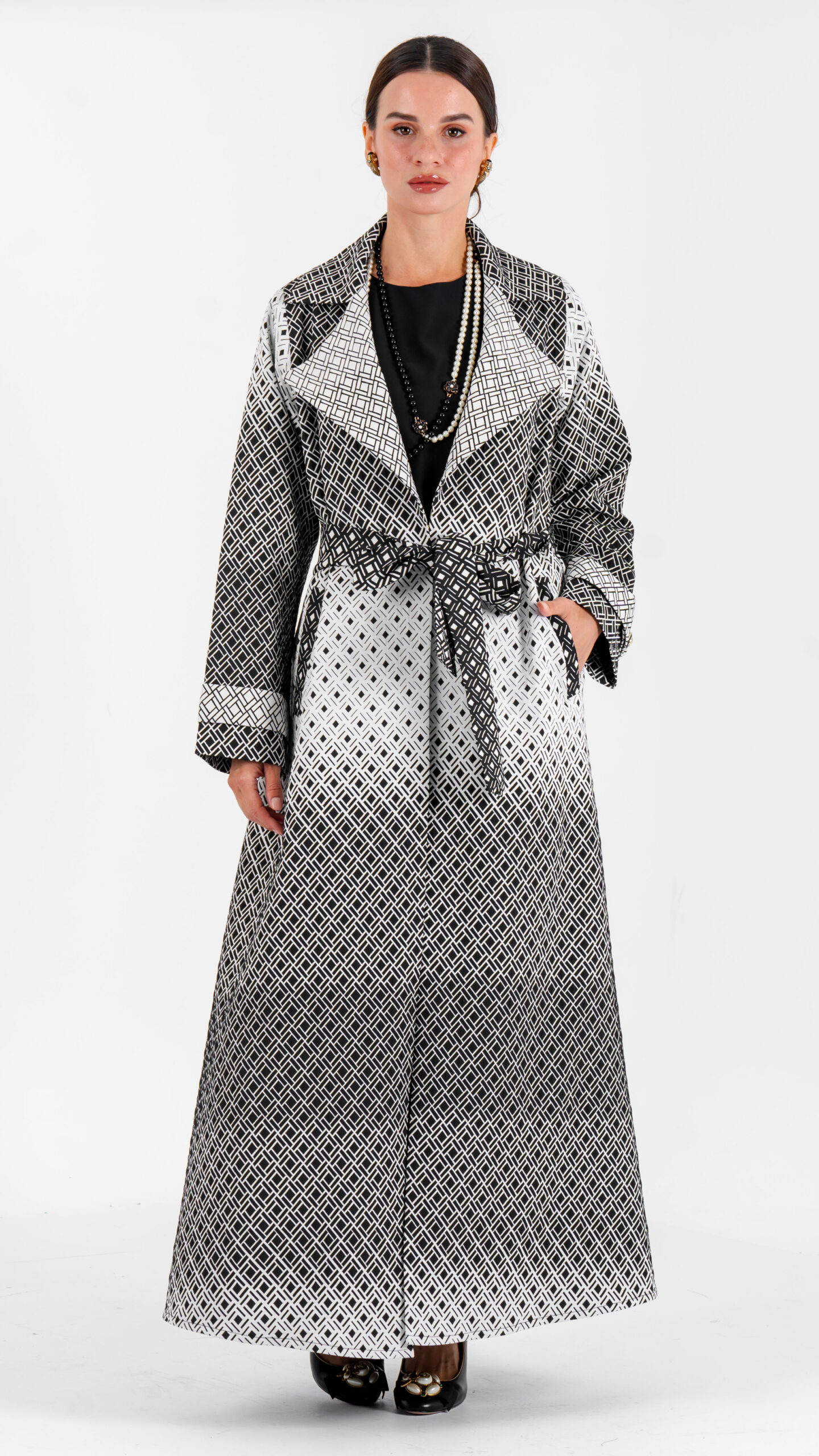 • THE STUNNING BLACK AND WHITE PATTERNED ABAYA MADE WITH UNIQUE LIGHT WEIGHT JACQUARD MATTE FABRIC WITH NARROW SLEEVES CHROCHET WITH BUTTON , SLIGHTLY SPREAD LAPELS SIGNATURE STYLE BELT DESIGN , BUETIFULL PATTERNS AND SIGNATURE STYLE ” VELVET “.
